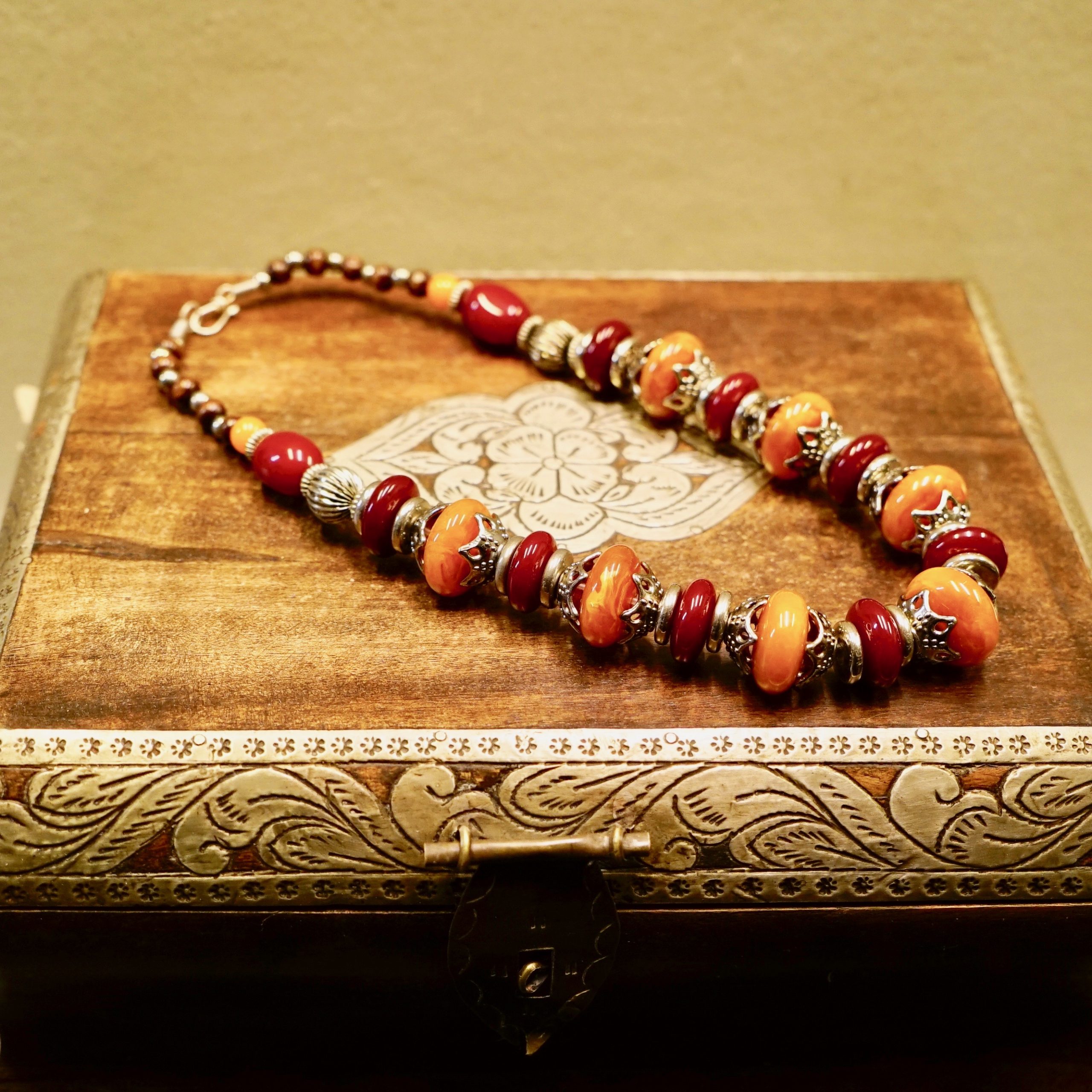 Hornkette in schönen Orange- und Rottönen ergänzt durch Metallelemente.