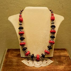 Diese Kette ist ein echter Blickfang. Die glänzenden schwarzen Glasperlen werden ergänzt durch einen schönen und filigran gearbeiteten Metallanhänger.