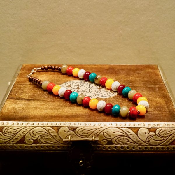 Diese Kette strahlt pure Lebensfreude aus. Die bunt gefärbten Hornperlen lassen sich zu vielen Kleidungsstücken problemlos kombinieren.